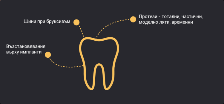 Протетичната дентална медицина включва лечението на дефектите на зъбната коронка, цяло и частично обеззъбяване, зъбна абразия, както и наличието на парафункции – бруксизъм и бруксомания.