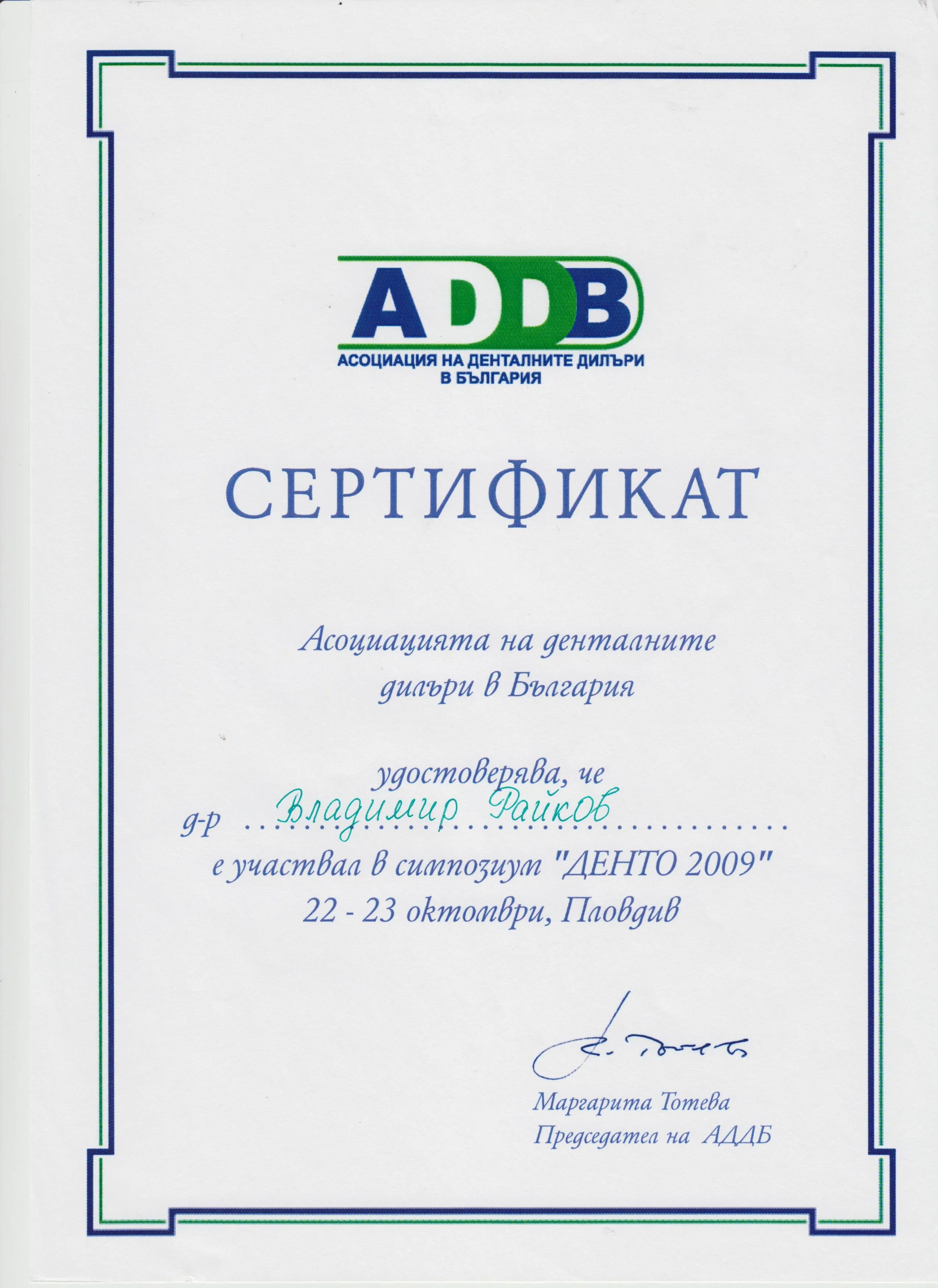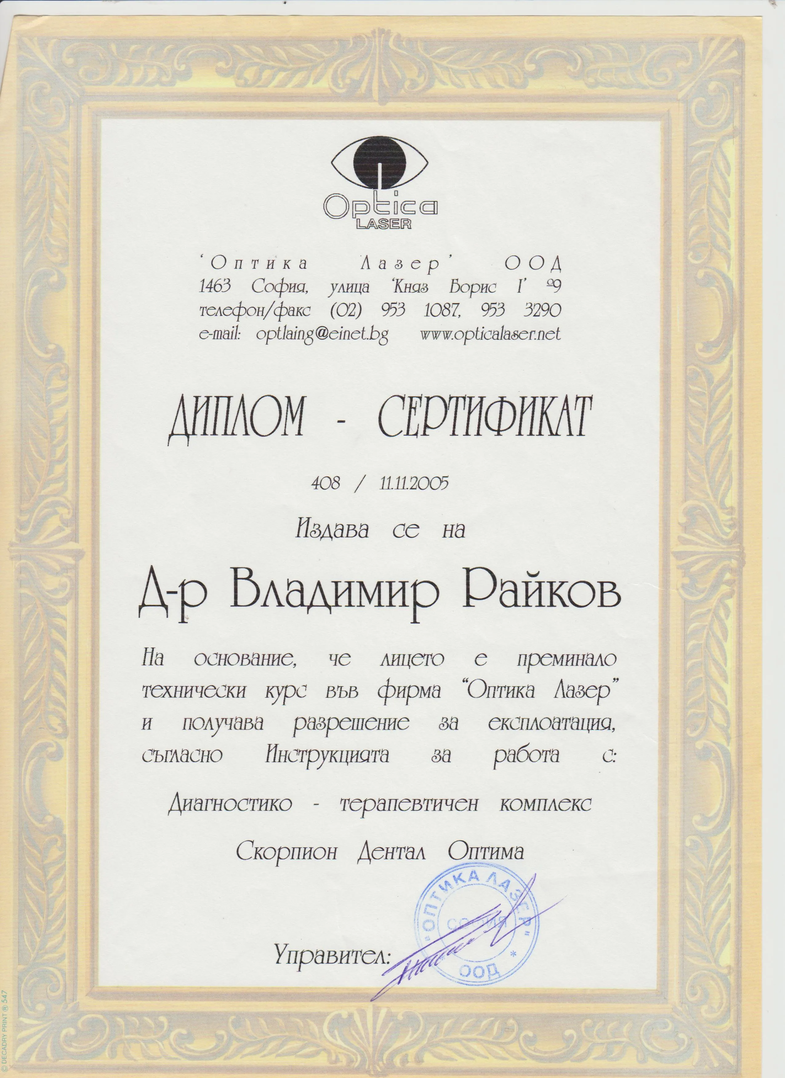 Д-р Владимир Петров Райков – лекар по дентална медицина, завършил Мед. Университе гр. Пловдив – факултет по дентална медицина през 2005 година.